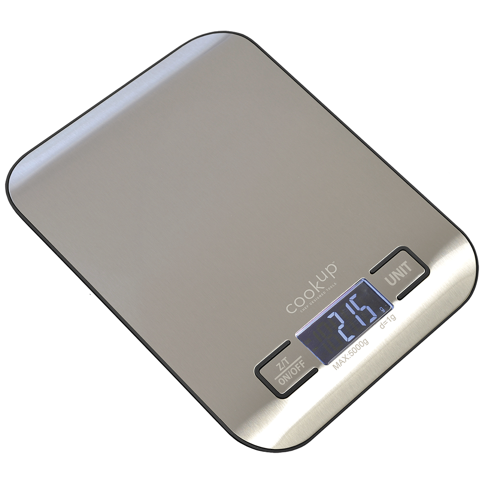 The CookUP Digital Kitchen Scale features a durable stainless steel top, combining functionality with a touch of sophistication. The sleek design complements any kitchen decor, making it a stylish addition to your culinary workspace.