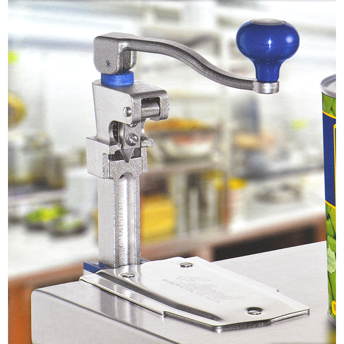 Table style can opener with new plated steel base for cans up to 7" tall.