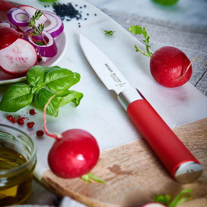 Even at first sight, the beholder experiences the inspiration and passion that emerge from this. Get to know a knife series that sets no boundaries to your creativity and your passion for cooking. Get inspired by the surprising cutting experience.The knives of our series Red Spirit are designed for uncompromising sharpness. The blades are grinded extremely slim and the cutting edge is polished. The knives are easy to guide and lead to a stunning exact cut. The material to be cut will neither be crushed nor broken so that flavourings will be preserved.The round shaped, Asian-style handle of the knife features an extraordinary haptic. It lies perfectly in the hand while fulfilling all ergonomic requests of professionals as well as ambitious amateur chefs – a very important advantage for intensive usage.With the knife series Red Spirit, Friedr. Dick presents you a product – Made in Germany – combining quality, ergonomics, functionality and precision at highest perfection.
