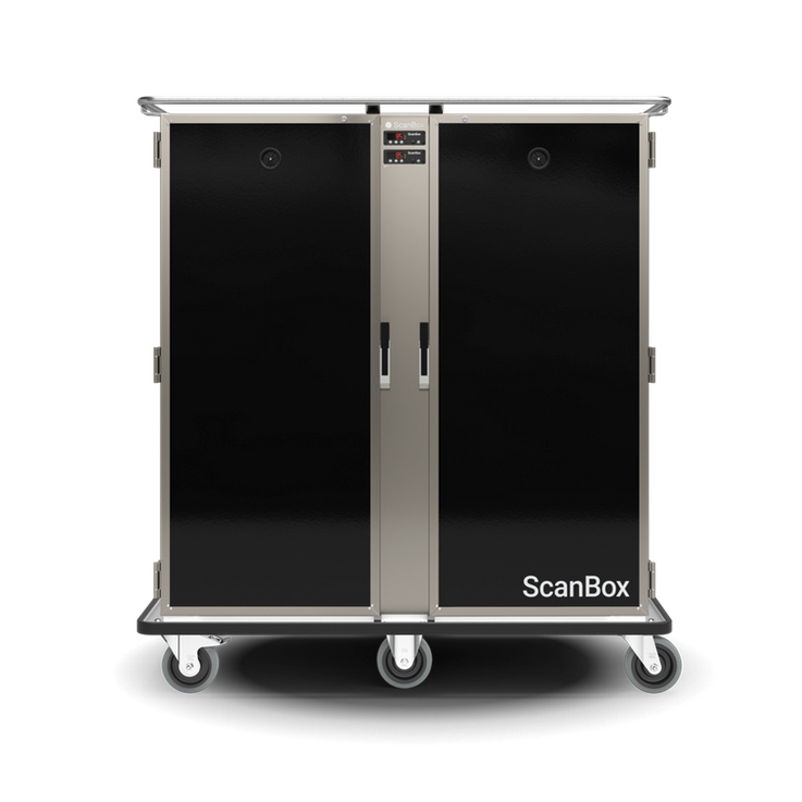 Banquet Line Duo HF16+HF16 is a light weight, yet heavy duty, cart for holding and transportation of hot food with GN2/1 capacity. One cart but two separate compartments that each hold 16 runners, a fan heating system for fast and uniform heating, and a user friendly temperature controller with infinitely variable temperature setting up to +90°C. Total capacity of 32 GN2/1 or 64 GN1/1 containers given 65mm CC. Detachable U-shaped runners offer safe handling, easy cleaning and optimal temperature distribution. Other features are adjustable ventilation for optimal moisture control, ergonomic push/pull handles and easy-to-roll 160mm castors. A ScanBox is a Scandinavian designed product made for both back and front of house, especially with the Signature option with the possibility to customize the exterior design.