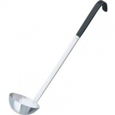 8 ounce stainless steel ladle with black coated handle.