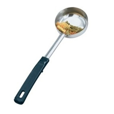 5oz stainless steel portion control server with black handle.