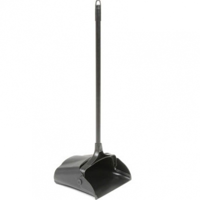 Long-handled dust pan with black finish.