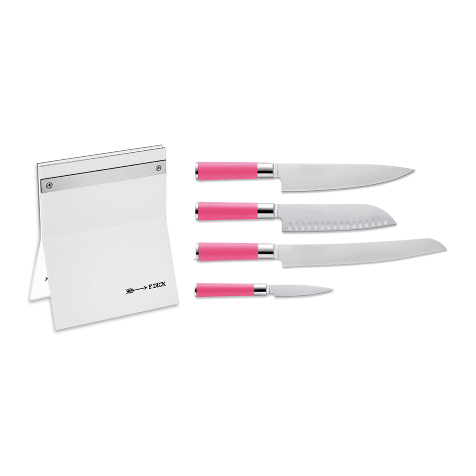 The Pink Spirit (4) piece set series features the same popular paring, santoku, chef and bread knives from the renowned Friedr. Dick Red Spirit line, presented with all-new stunning pink handles. This set comes complete with a stylish acrylic knife block.