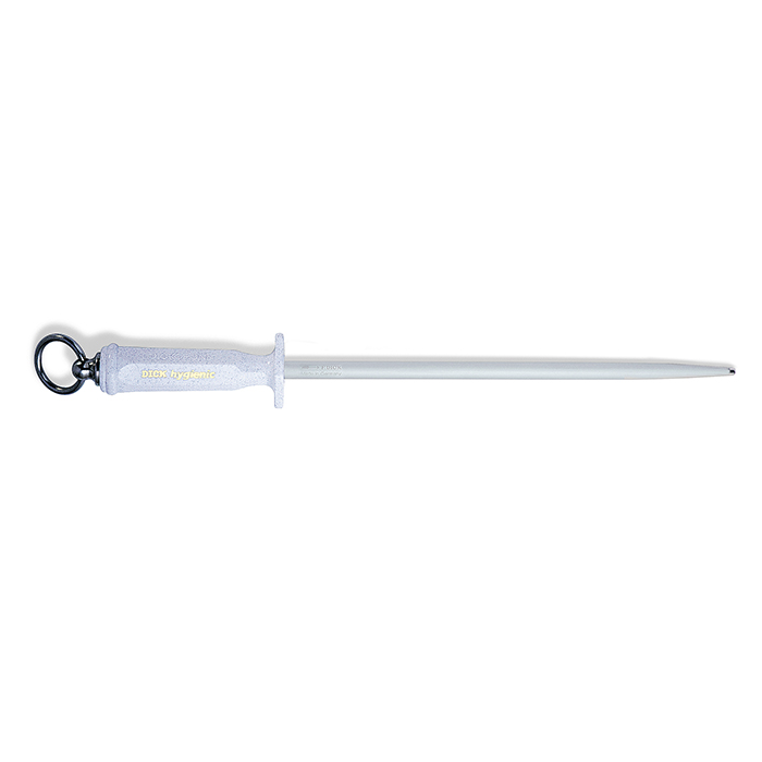 DICK hygienic has a stainless steel blade with an ultra-fine cut as well as stainless steel fittings and an full plastic handle. We recommend it especially when using intensive cleaning agents and methods. The ultra-fine cut of DICK hygienic creates a fine abrasion effect and straightens the cutting edge of the knife. With our DICK hygienic, you can choose between a round and an oval blade shape, each with a length of 30 cm