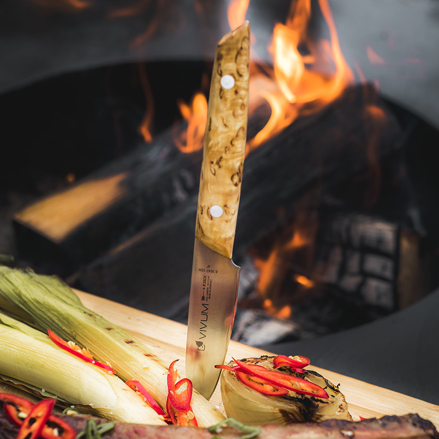 The VIVUM series stands for manual craftsmanship instead of serial uniformity. As a unique piece, each knife is finished by hand by our experienced staff. We use a special high-alloy steel for the VIVUM series because the steel quality significantly contributes to a sharp cutting experience. This steel offers excellent cutting performance, exceptional hardness and good corrosion resistance. During the hardening process, the blade is hardened under protective gas at 1,100 °C. The blades are then ice tempered down to -197° C to ensure the necessary flexibility and resilience of the knives and to optimise the material structure. This results in an optimal hardness of 58 HRC. The knives are therefore extremely sharp and ready for use in kitchens and on barbecues around the world.